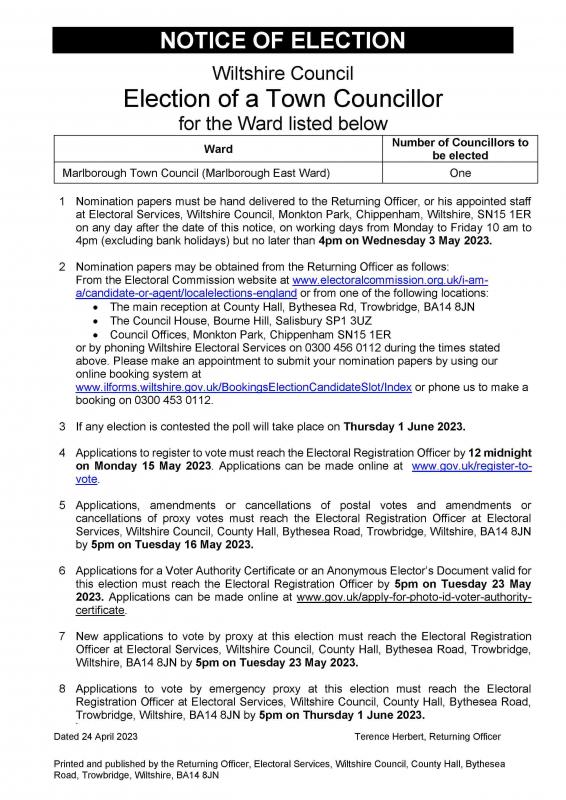 A copy of the Notice will also be published on the Wiltshire Council website on 24 April 2023 at: https://elections.wiltshire.gov.uk/Home/Upcoming