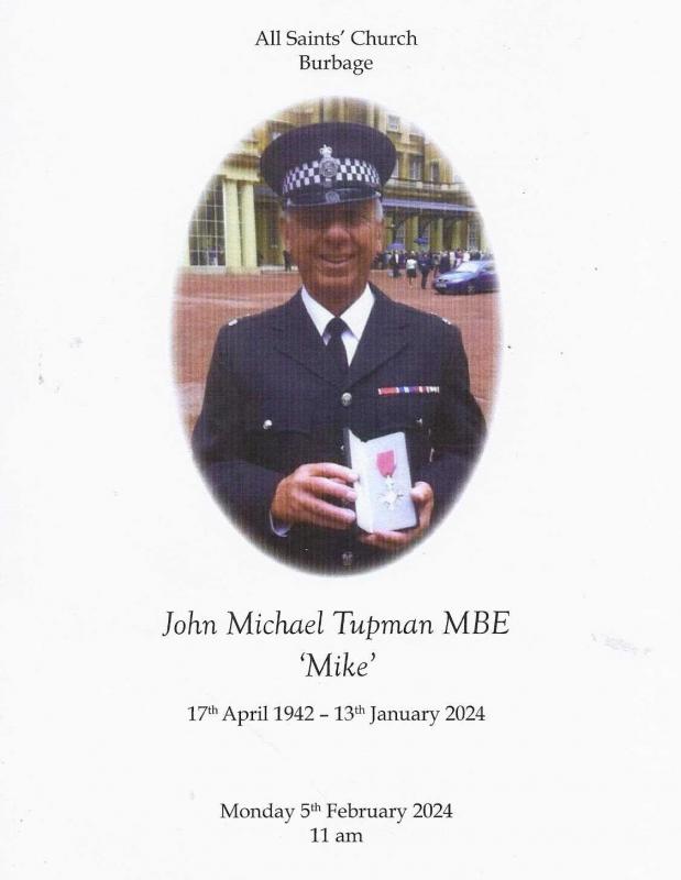 John Michael Tupman MBEToday, Monday 5 February, our Mayor, Councillors, officers and former councillors and officers joined hundreds of Mike's family and friends, former colleagues from Cadbury and Wiltshire Police, and the Town Crier community at All Saints Church, Burbage, to say goodbye to a much loved and respected man. Mike had instructed his daughters, Carole and Helen, that his funeral should be a celebration and it really was, with so many people sharing their stories and tributes to Mike.