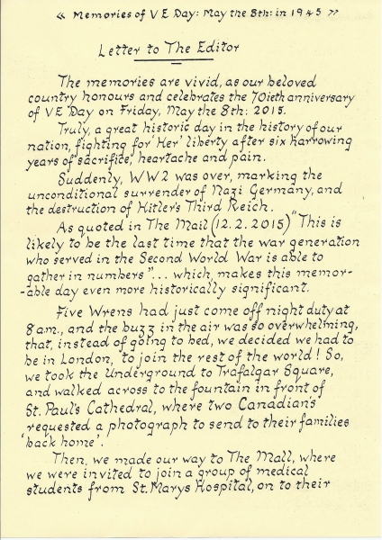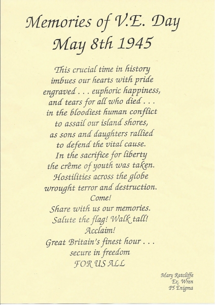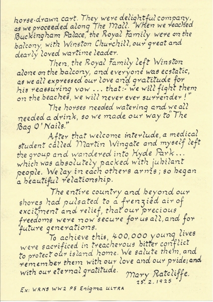 Mary Ratcliffe, a Wren based with the Codebreakers at Bletchley Park in WWII, came in to see us to share her memories of celebrating VE day. She met a young man that day who became an important part of her life... click on the images to read her story.