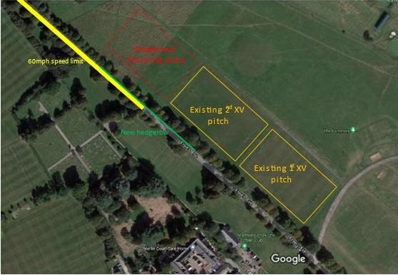 The planting of a previously existing hedgerow along the Frees avenue side as part of mitigating biodiversity works and as a road safety measure along the border of the ‘training area’ parallel to Frees Avenue.