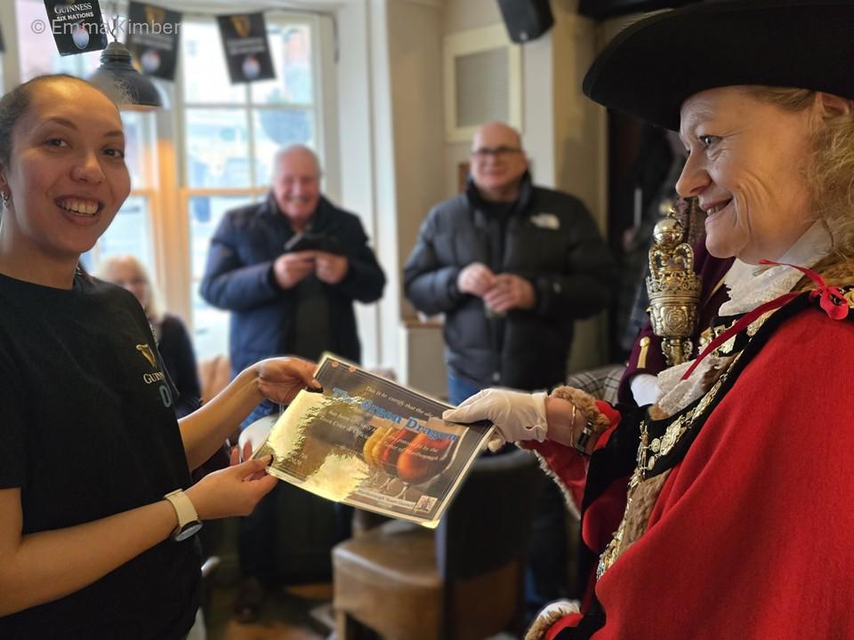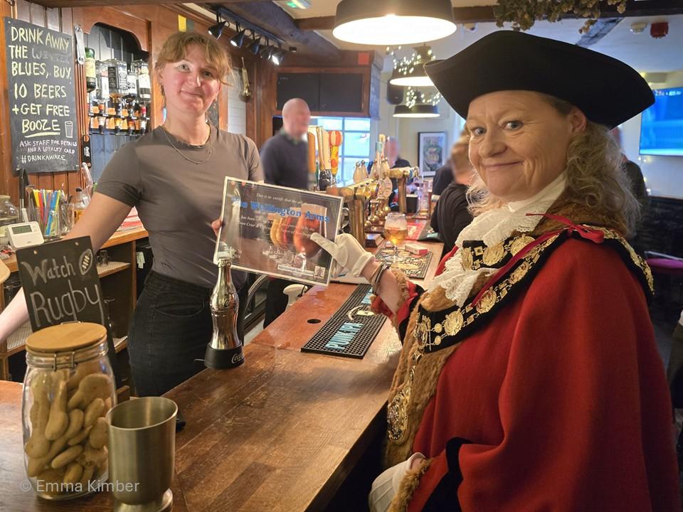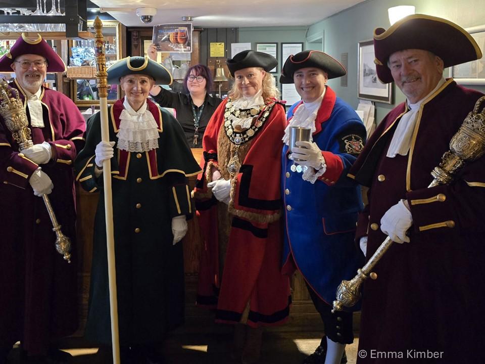 The Town Mayor Cllr Emily Trow accompanied by Town Crier Emma Kimber, Town Beadle Linda Illsley and Mace Bearers Barry Mercer and Dave Blacklock visited Marlborough’s public houses to assess the quality of the ale served.